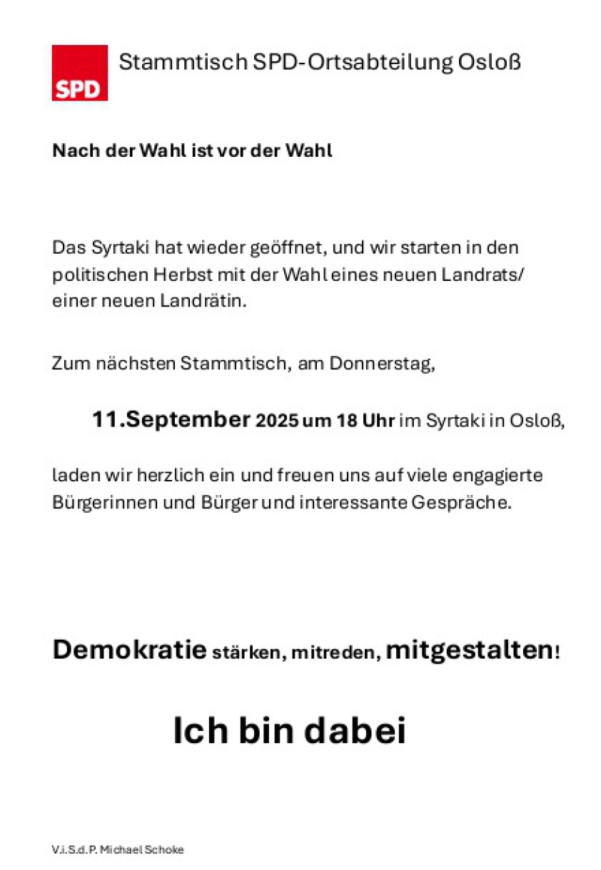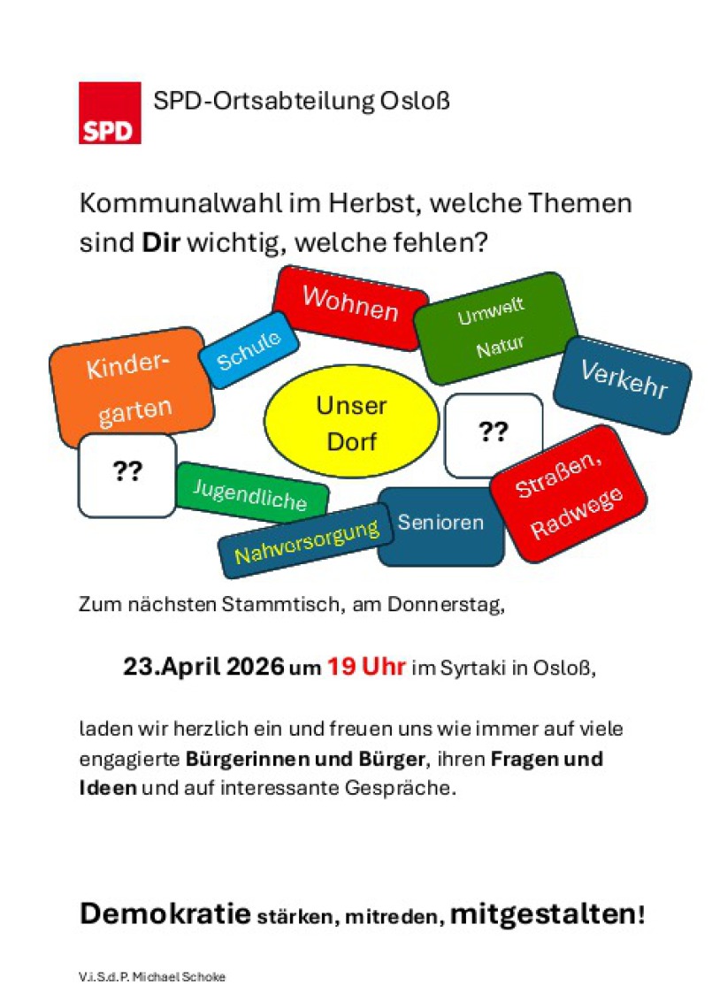 Die Oslosser Ratsmitglieder wählten am 26.03.25 Frank Roth (SPD) einstimmig zum neuen Bürgermeister. Zu seinem 1.Vertreter und allgemeinen Verwaltungsvertreter wurde